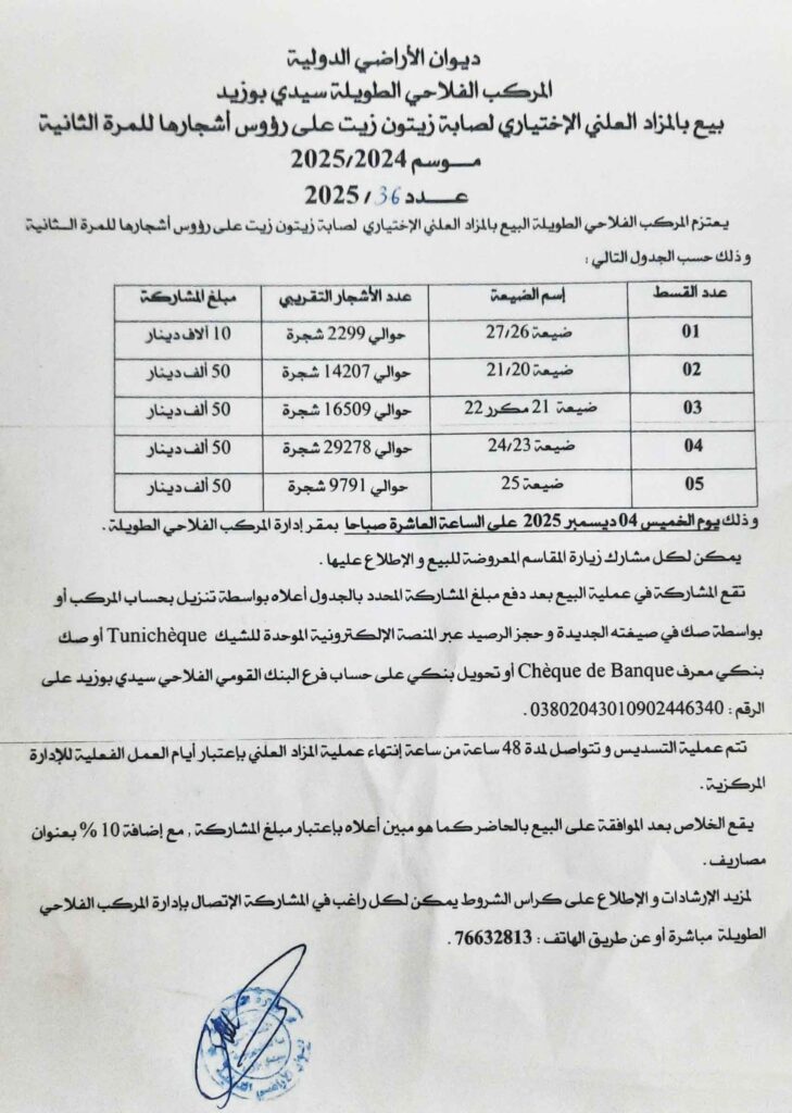 بيع بالمزاد العلني الإختياري لصابة زيتون زيت على رؤوس أشجارها للمرة الثانية
