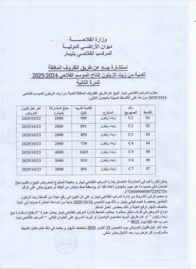 بيع عن طريق الظروف المغلقة لكمية من زيت الزيتون إنتاج الموسم الفلاحي 2024-2025 للمرة الثانية